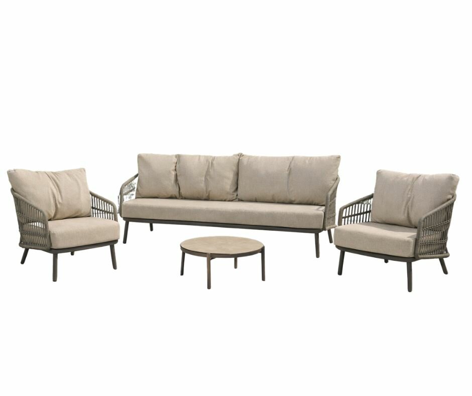 - This set comes with 1 x Alicante Terre 3 seater bench, 2 living chairs, Yoga coffee table (printed ceramic 73cm d x 35cm h)