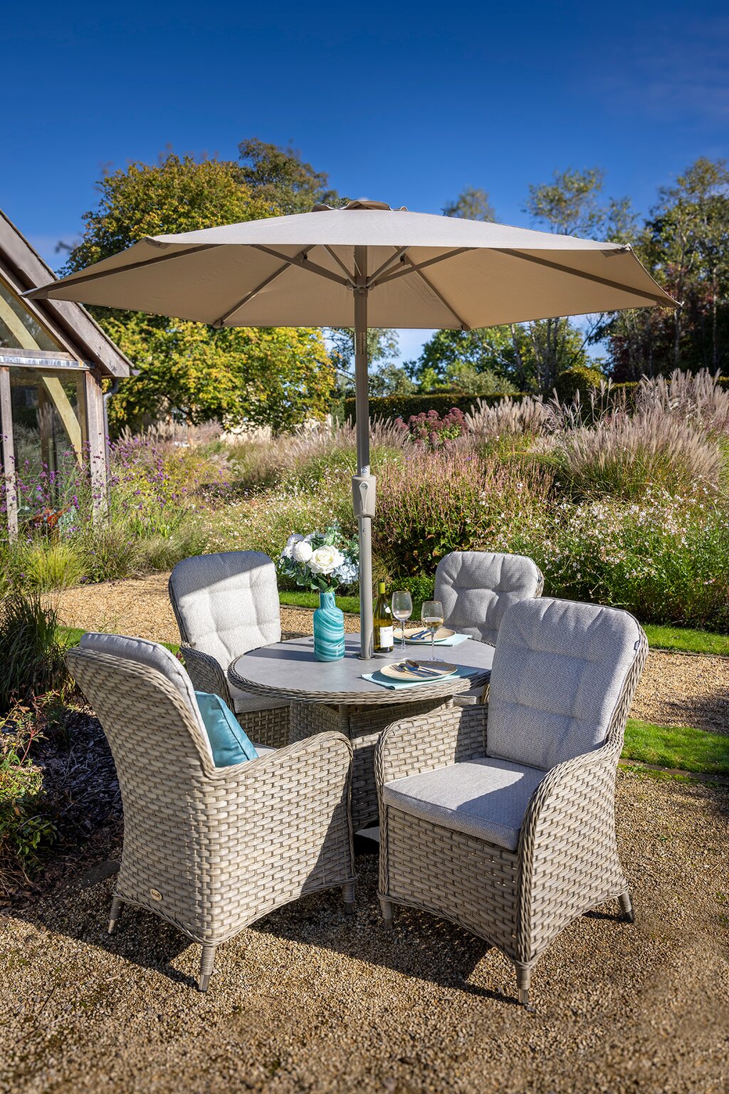 Write a review about "Eton 4 Seat Round Dining Set with Parasol and Base"